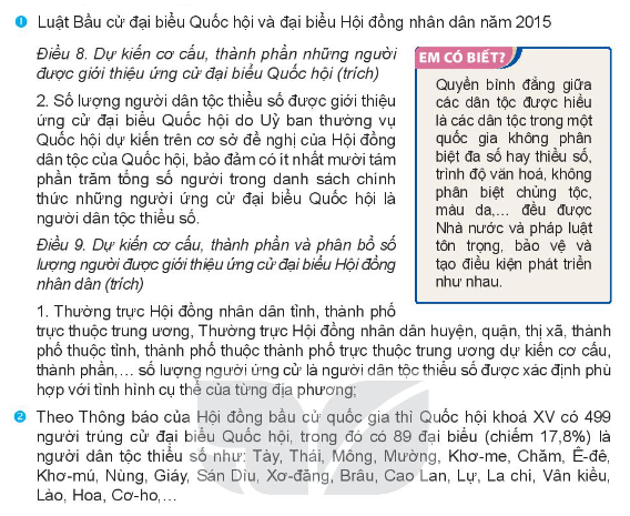 2/ Đọc thông tin 2 và nêu biểu hiện của quyền bình đẳng về chính trị giữa các dân tộc ở Việt Nam được thể hiện trong thông tin đó.