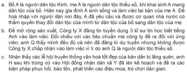 Đọc các trường hợp và phân tích hành vi của các chủ thể là thực hiện đúng pháp luật hay vi phạm pháp luật về quyền bình đẳng giữa các dân tộc. Giải thích.
