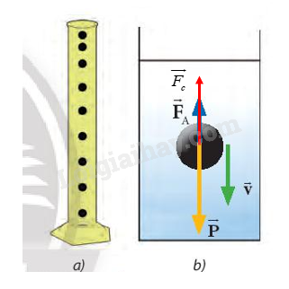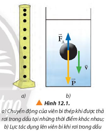 2. Quan sát Hình 12.1, vẽ vectơ lực cản của dầu tác dụng lên viên bi và mô tả chuyển động của viên bi khi được thả không vận tốc đầu vào dầu.