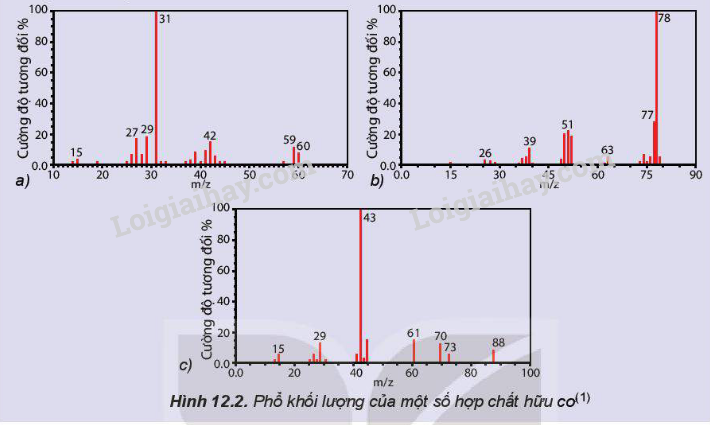 Hãy gán các chất hữu cơ sau: C6H6; C3H8O; C4H8O2 vào các phổ khối lượng tương ứng dưới đây.