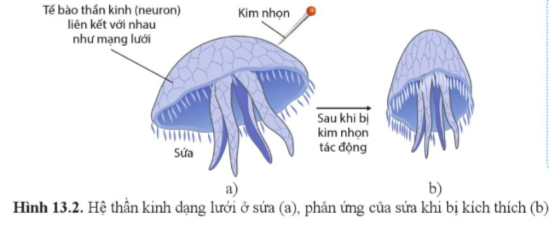 Quan sát hình 13.2 và nêu đặc điểm cấu tạo của hệ thần kinh dạng lưới. Sứa phản ứng như thế nào khi bị kích thích vào một điểm trên cơ thể?
