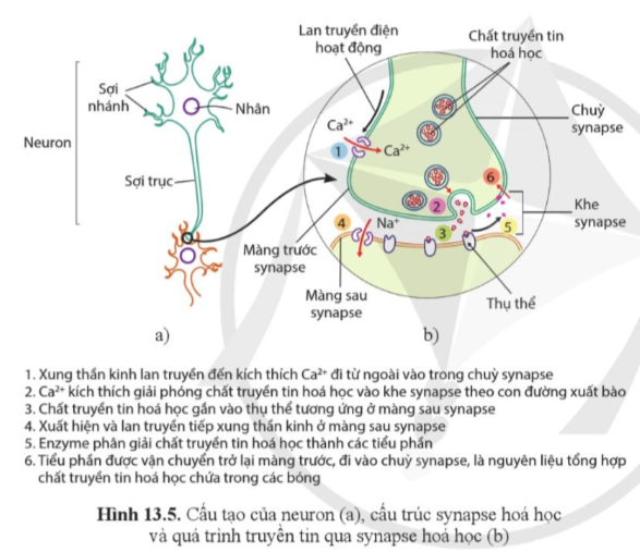 Quan sát hình 13.5, mô tả quá trình truyền tinh qua synapse hóa học.