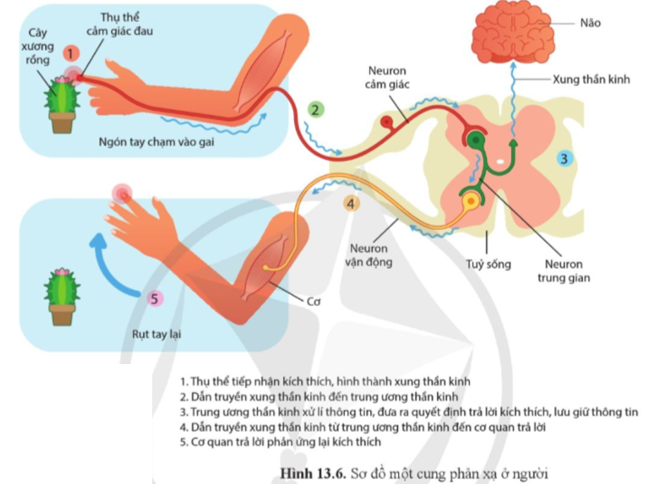 Dựa vào sơ đồ 1 cung phản xạ trong hình 13.6 mô tả các khâu.