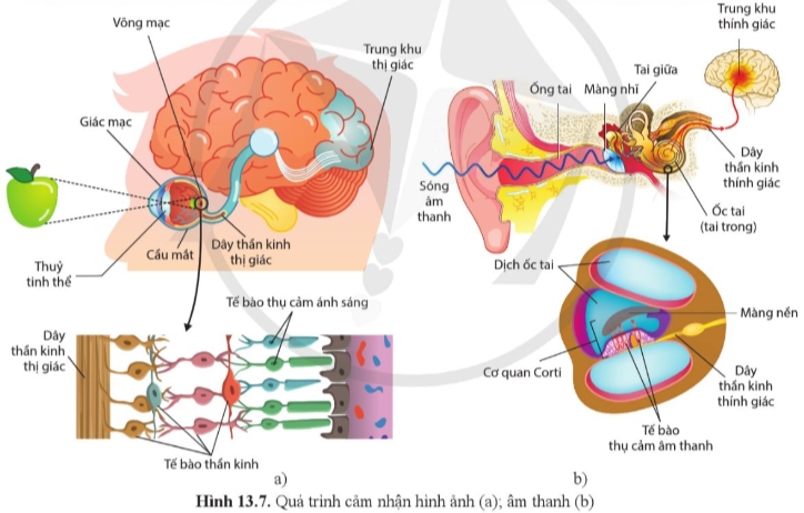 Dựa vào hình 13.7 để mô tả cơ chế cảm nhận hình ảnh và âm thanh.