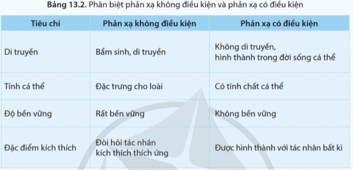Dựa vào bảng 13.2, nêu đặc điểm của phản xạ không điều kiện và phản xạ có điều kiện.