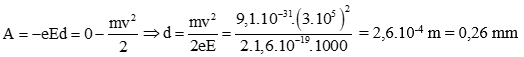 Một electron chuyển động dọc theo đường sức của một điện trường đều. Cường độ điện trường E = 1000 V/m. Vận tốc ban đầu của electron là 3.105 m/s, khối lượng của elctron là 9,1.10-31kg. Tại lúc vận tốc bằng không thì nó đã đi được đoạn đường bao nhiêu ?
