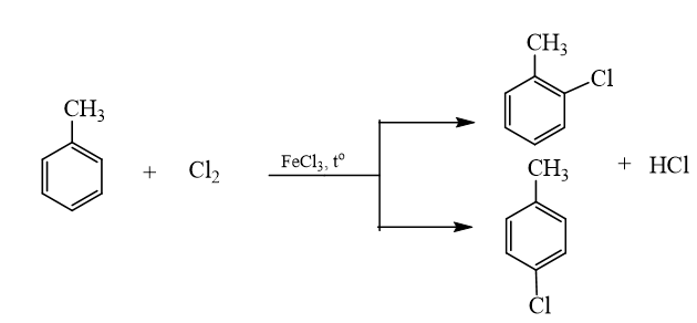 Theo Data Bridge Market Research trong giai đoạn 2021 – 2028, tốc độ tăng trưởng thương mại của chlorotoluene (bao gồm các đồng phân khác nhau) vào khoảng 6,2% hằng năm và đạt đến 3 654,7 triệu USD vào năm 2028. Chlorotoluene được sử dụng trong các lĩnh vực hoá dược, hoá nông, polymer, dệt,… và được điều chế bằng phản ứng giữa chlorine và toluene. Viết phương trình hoá học và nêu rõ điều kiện của phản ứng trên.