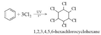Phản ứng cộng vào vòng benzene xảy ra trong những điều kiện khắc nghiệt (nhiệt độ cao, áp suất cao, chiếu tia tử ngoại).