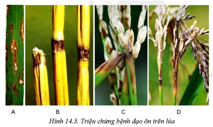 Quan sát Hình 14.5 và mô tả các triệu chứng của bệnh đạo ôn hại lúa.