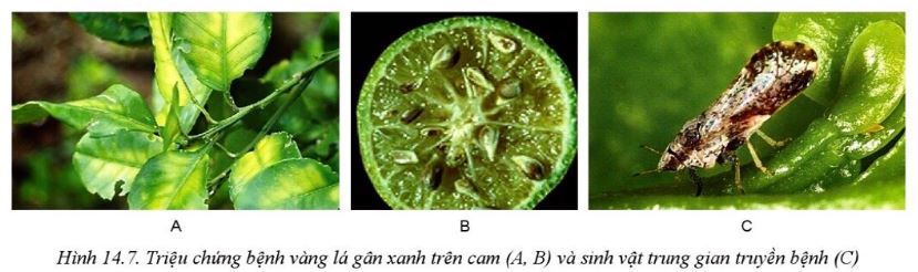 Quan sát Hình 14.7 và mô tả triệu chứng của bệnh vàng lá gân xanh hại cam.