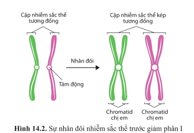 Quan sát hình 14.2 và cho biết trước khi bắt đầu giảm phân I, nhiễm sắc thể trong nhân tế bào ở trạng thái đơn hay kép. Đặc điểm này có ý nghĩa gì?
