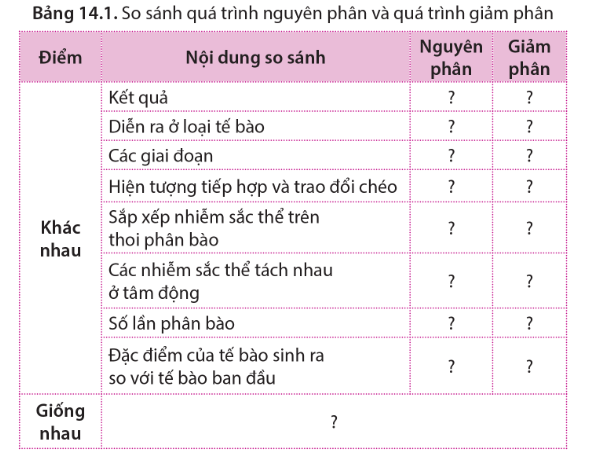 Lập bảng so sánh quá trình nguyên phân và quá trình giảm phân theo gợi ý trong bảng 14.1.