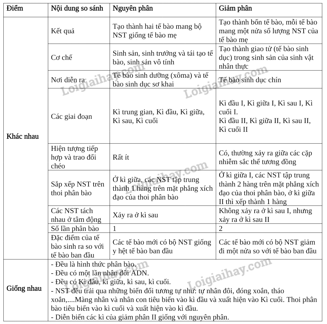 Nguyên phân là quá trình xuất hiện ở các tế bào sinh dưỡng và tế bào sinh dục sơ khai, giảm phân là quá trình xảy ra ở các tế bào sinh dục chín.