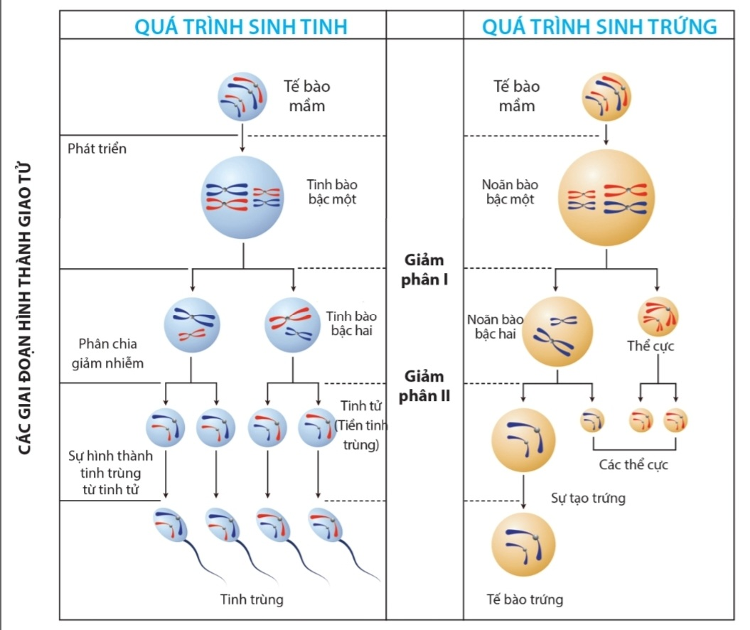 – Sự hình thành của giao tử thông qua sự giảm phân từ cá tế bào mầm, tạo thành gia tử đực hoặc giao tử cái.
