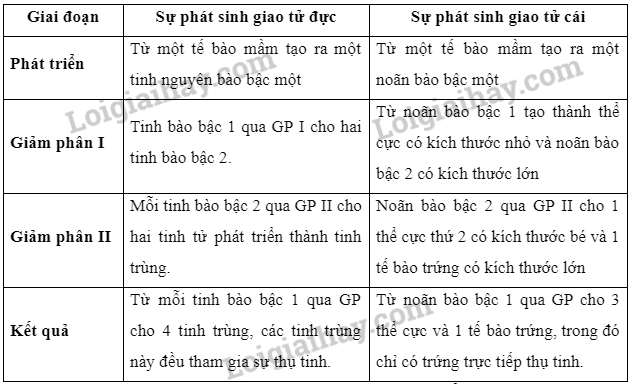 – Sau giảm phân, từ một tinh nguyên bào bậc 1 tạo ra 4 tinh trùng, còn từ noãn bào bậc 1 tạo thành 3 thể cực và 1 tế bào trứng.