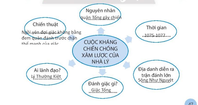 Hoàn thành sơ đồ tư duy dưới đây về cuộc kháng chiến chống quân xâm lược Tống của nhà Lý bằng cách viết câu phù hợp vào mỗi ô trống.