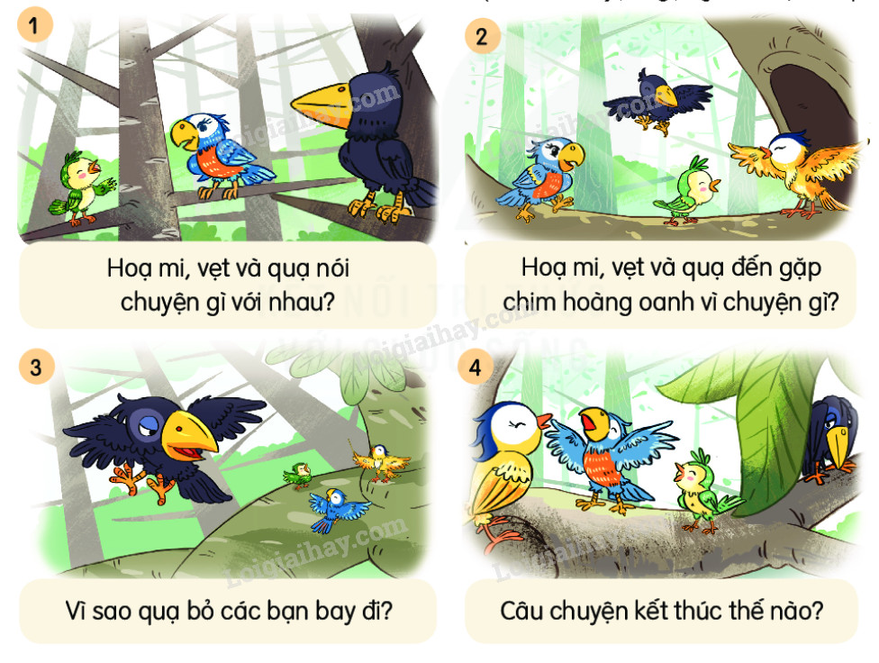 (1) Ngày xửa ngày xưa, hoạ mi, vẹt và quạ đều không biết hát. Một hôm, hoạ mi nói với các bạn:
