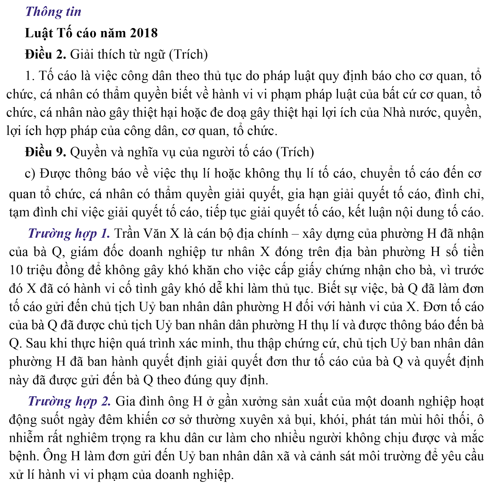 a. Đọc thông tin, trường hợp hợp và nêu được những quyền bà Q có được khi làm đơn tố cáo đối với hành vi của Trần Văn X.