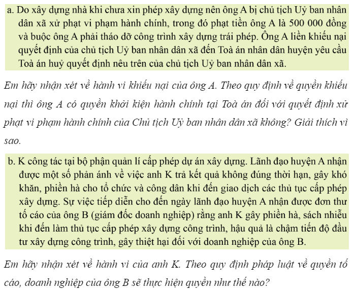 a. – Đọc tình huống và nhận xét về hành vi khiếu nại của ông A trong tình huống đó.