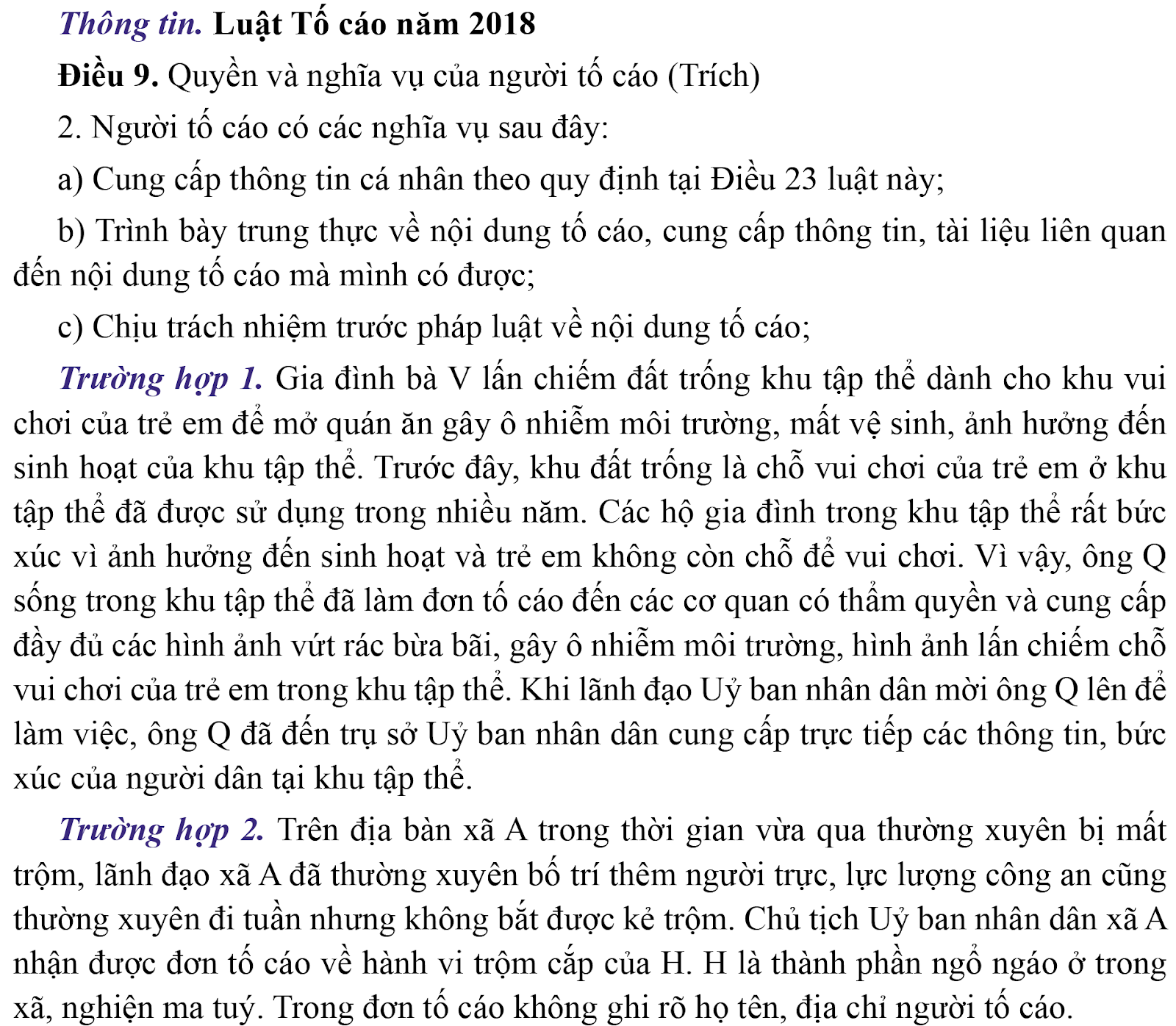 a. Đọc thông tin, trường hợp và nhận xét về trách nhiệm của ông Q khi quyết định tố cáo bà V lấn chiếm đất khu tập thể trong trường hợp 1.
