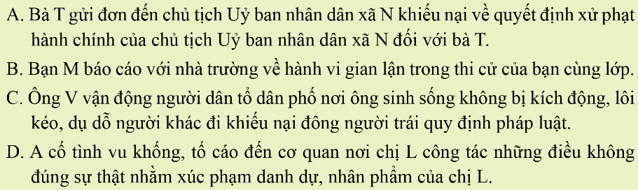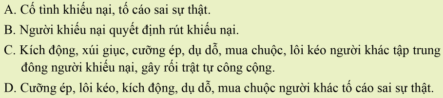 + A. Cố tình khiếu nại, tố cáo sai sự thật.
