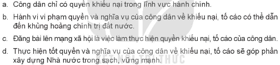 c. Sai, vì khi thực hiện quyền khiếu nại, tố cáo, công dân phải gửi đơn khiếu nại, tố cáo đến cơ quan, tổ chức, cá nhân có thẩm quyền giải quyết theo đúng quy định của pháp luật. Việc đăng bài lên mạng xã hội không có giá trị về mặt pháp lí nên sẽ không được giải quyết, đồng thời việc này còn có thể gây ra nhiều hậu quả xấu như khiến người khác hiểu nhầm, gây xung đột, mâu thuẫn.
