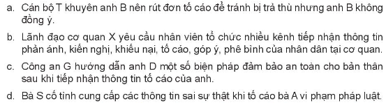 Đọc các trường hợp và phân tích trường hợp để chỉ ra được chủ thể đã thực hiện đúng hay vi phạm quyền và nghĩa vụ của công dân về khiếu nại, tố cáo. Giải thích.