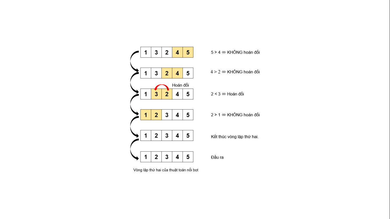 1. Em hãy liệt kê các bước của thuật toán sắp xếp nổi bọt để sắp xếp các số 3, 2, 4, 1, 5, theo thứ tự tăng dần.
