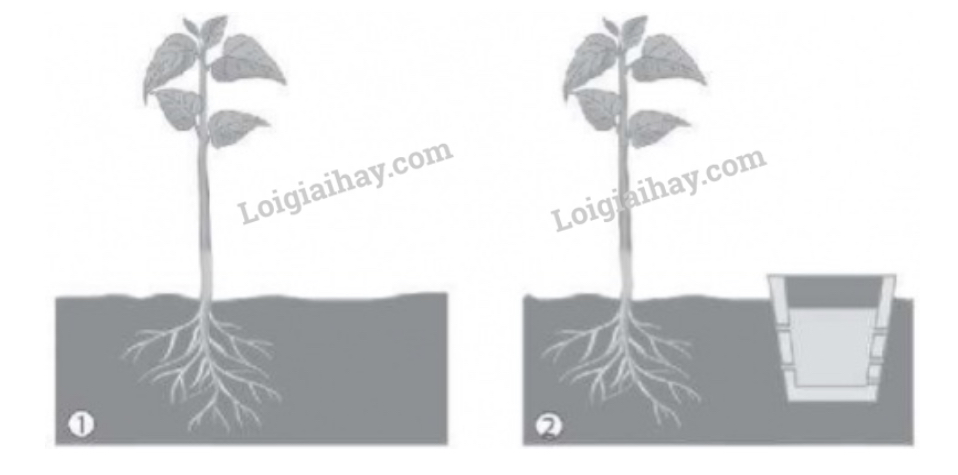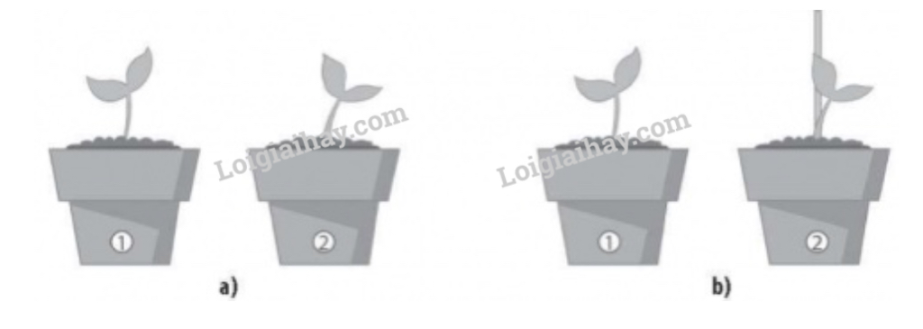 Bước 1: Trồng hai cây thân leo (bầu, bí,…) vào hai chậu (được đánh số 1 và 2) có chứa đất ẩm (Hình 16.1a).