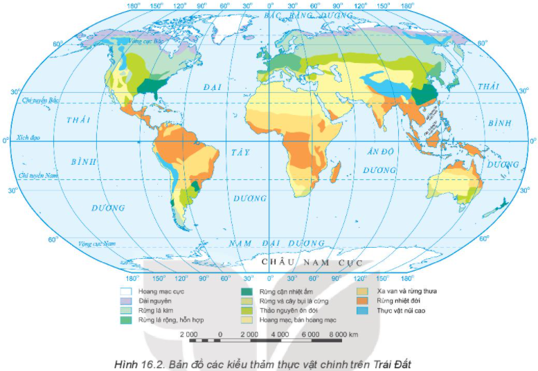 Quan sát hình 16.2, đọc chú giải để biết được các thảm thực vật chính từ cực về Xích đạo và màu sắc thể hiện chúng trên bản đồ để xác định phạm vi phân bố.