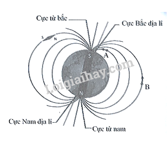 b) Chiều của đường sức từ đi ra ở cực nam địa lí và đi vào ở cực bắc địa lí. Chiều đường sức từ đi qua điểm A và B được xác định như hình vẽ: