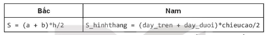 Hai bạn Bắc và Nam được yêu cầu viết công thức tính diện tích hình thang trong Python theo mấy câu thơ sau “Muốn tìm diện tích hình thang/Đáy trên đáy dưới ta mang cộng vào/Rồi đem nhân với chiều cao/Chia đôi lấy nửa thế nào cũng ra”. Kết quả như sau: