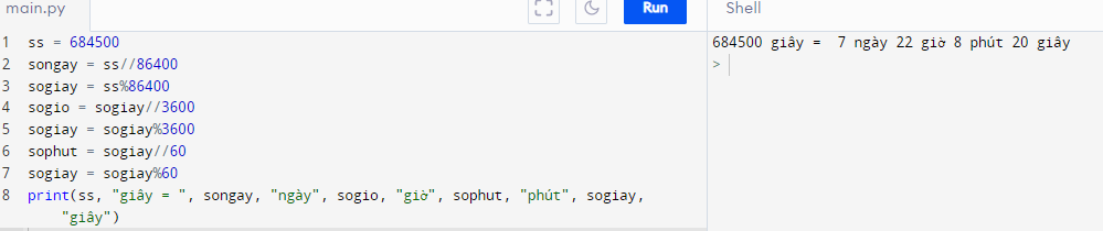 print(ss, “giây = “, songay, “ngày”, sogio, “giờ”, sophut, “phút”, sogiay, “giây”)
