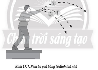 Ba quả bóng giống hệt nhau được ném ở cùng một độ cao từ đỉnh của tòa nhà như Hình 17.1. Quả bóng (1) được ném phương ngang, quả bóng (2) được ném xiên lên trên, quả bóng (3) được ném xiên xuống dưới. Các quả bóng được ném với cùng tốc độ đầu. Bỏ qua lực cản của không khí. Sắp xếp tốc độ của các quả bóng khi chạm đất theo thứ tự giảm dần.