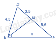 Xét tam giác EDF có EM là tia phân giác của góc FED nên \(\frac{{DM}}{{MF}} = \frac{{ED}}{{FE}}\) hay \(\frac{{3,5}}{{5,6}} = \frac{{4,5}}{x}\)