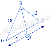 \(\frac{{GH}}{{HF}} = \frac{{EG}}{{FE}}\) hay \(\frac{x}{{20 – x}} = \frac{{18}}{{12}}\)