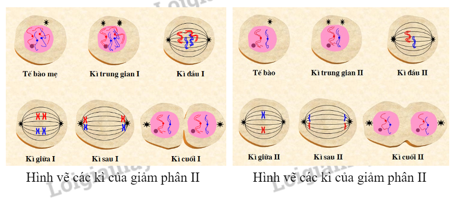 Kì sau II: 2 chromatid trong từng NST kép tách nhau ở tâm động thành 2 NST đơn và đi về hai cực của tế bào.