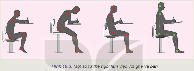 Hình 19.1 là các bộ bàn, ghế được thiết kế để ngồi làm việc. Hãy quan sát và chỉ ra những điểm bất hợp lí trong từng hình và thử đề xuất điều chỉnh cho thiết kế phù hợp hơn với người ngồi.