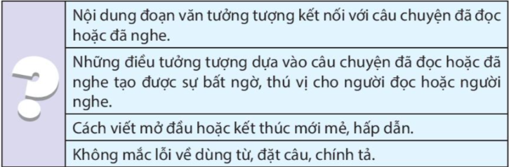 Viết đoạn văn tưởng tượng dựa vào một câu chuyện đã đọc hoặc đã nghe. Dựa vào các ý đã tìm trong hoạt động Viết ở Bài 18, viết đoạn văn theo yêu cầu của đề bài. Đọc soát đoạn văn. Sửa lỗi đoạn văn. Chia sẻ với người thân về nội dung tưởng tượng trong đoạn văn em viết.
