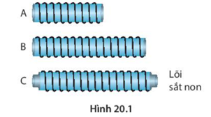 Hình 20.1 vẽ ba nam châm điện A, B, C. Mỗi nam châm đều có cùng một dòng điện chạy qua ống dây.