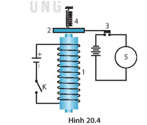 Đóng khóa K, nam châm (1) hoạt động, hút thanh thép đàn hồi (2); công tắc (3) đóng, dòng điện chạy vào động cơ điện (5). Muốn động cơ ngừng hoạt động thì ngắt khóa điện đầu vào, nam châm điện không còn từ tính, lò xo (4) kéo thanh thép lên, công tắc (3) ngắt điện chạy vào động cơ, động cơ ngừng hoạt động.