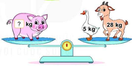 Quan sát tranh ta thấy cân thăng bằng, do đó cân nặng của con lợn bằng tổng cân nặng của con ngỗng và con dê, từ đó tìm được cân nặng của con lợn.