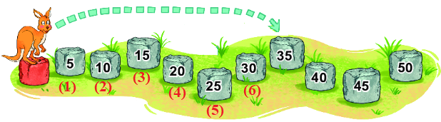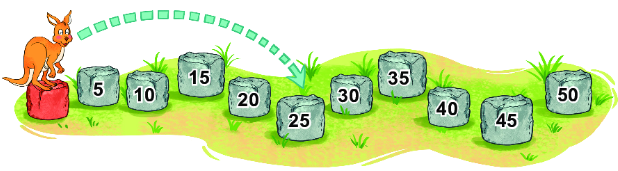 Chuột túi tham gia một cuộc thi nhảy xa. Lần thứ nhất, từ tảng đá màu đỏ, chuột túi nhảy qua 4 tảng đá và được 25 điểm (như hình vẽ). Lần thứ hai, từ tảng đá màu đỏ, chuột túi nhảy qua 6 tảng đá.