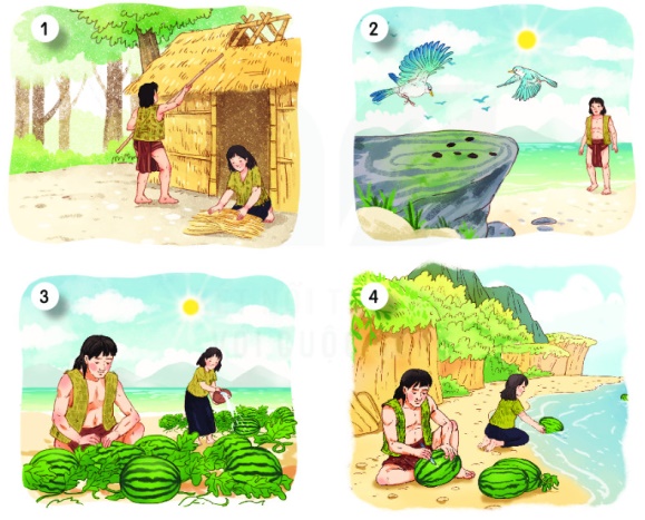 – Tranh 3: Nhờ công chăm sóc của hai vợ chồng, hạt đã nảy mầm rồi mọc ra một loại cây dây bò lan rộng. Cây ra hoa rồi ra quả. Quả có vỏ màu xanh thẫm, ruột đỏ, hạt đen nhánh, có vị ngọt và mát. Vợ chồng Mai An Tiêm vui  mừng đem hạt gieo trồng khắp đảo.