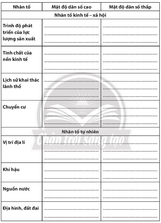 Phân tích các nhân tố ảnh hưởng đến phân bố dân cư. Lấy ví dụ minh họa để hoàn thành bảng sau: