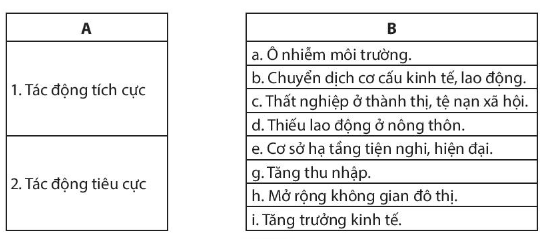 Em hãy nối các ý ở cột A với các ý ở cột B cho phù hợp với tác động của quá trình đô thị hóa
