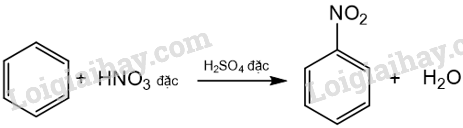 + Benzene phản ứng với nitric acid đặc (xúc tác sulfuric acid đặc), 1 nhóm NO2 thế 1 nguyên tử H trên vòng thơm.