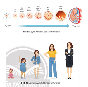 Quan sát các Hình 21.6, 21.7 và mô tả các giai đoạn phát triển của con người từ hợp tử đến cơ thể trưởng thành