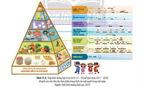 Quan sát Hình 21.9, kể tên và nêu vai trò của các phân tử sinh học có nhiều trong các loại thức ăn được khuyến cáo mức tiêu thụ thực phẩm trung bình cho một người trong một ngày