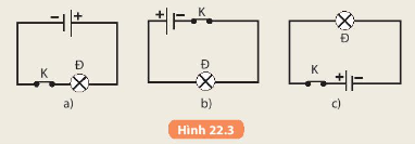 4. Dòng điện cung cấp bởi pin hoặc acquy có chiều không đổi gọi là dòng điện một chiều. Người ta quy ước chiều dòng điện trong mạch điện là chiều từ cực dương của nguồn điện qua dây nối và các dụng cụ tiêu thụ điện tới cực âm nguồn điện. Vẽ mũi tên chỉ chiều dòng điện trong các sơ đồ mạch điện ở Hình 22.3.